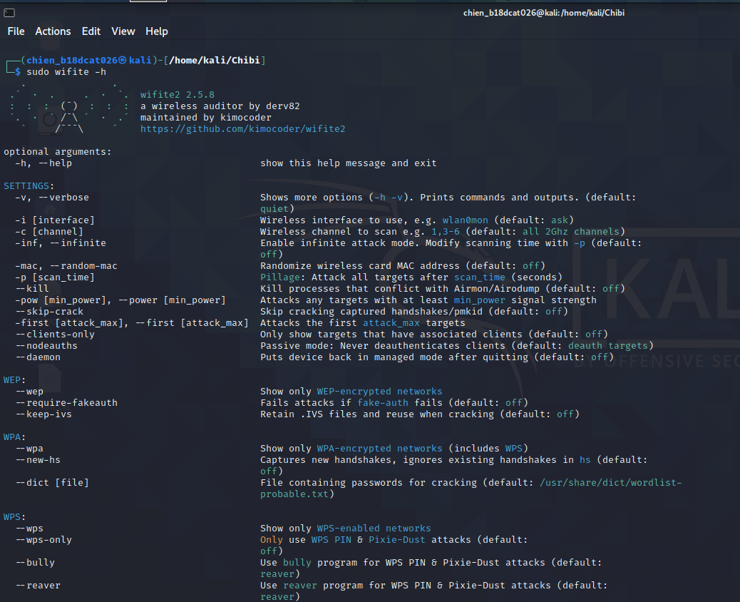 Wifite là một công cụ tự động để tấn công nhiều mạng không dây được mã hóa bằng WEP / WPA / WPA2 và WPS. Khi khởi động Wifite yêu cầu một vài tham số để làm việc và Wifite sẽ tự động tấn công vào Wifi được chỉ định bao gồm: bắt tay WPA, tự động khử xác thực các máy khách được kết nối, giả mạo địa chỉ MAC của bạn và bảo vệ mật khẩu bị bẻ khóa.