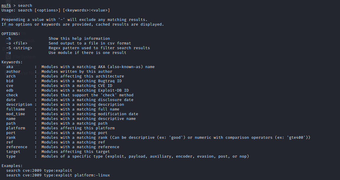 Câu lệnh này giúp cho chúng ta tìm kiếm một tấn công cụ thể, module phụ trợ hay payload dựa trên những keywords có sẵn như: aka, author, arch, ... và mỗi keyword đều được giải thích chi tiết ngay bên cạnh.
