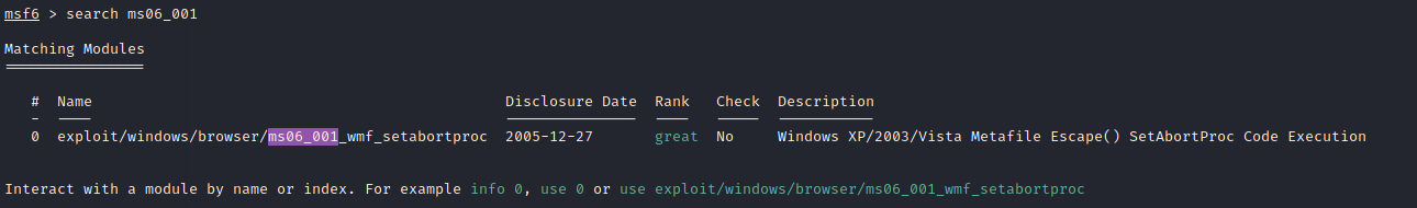 Nhập msf> search ms06_001 để tìm module khai thác: