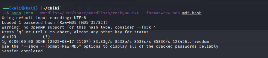 john --format=raw-md5 md5.hash với --format=raw-md5 là định dạng file cần hash ở dạng md5.