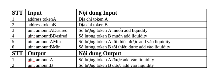 Nếu ít nhất 1 token có số dư khác 0 thì tính khối lượng qui đổi số lượng tokenB tối ưu từ số lượng tokenA mong muốn. Nếu kết quả nhỏ hơn số lượng tokenB mong muốn và không nhỏ hơn số lượng tokenB tối thiểu thì số lượng tokenB tối ưu này được add liquidity cùng với số lượng tokenA đã nhập vào