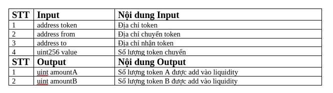 Chuyển số lượng token A là amountA, token B với số lượng amountB từ địa chỉ đang gọi hàm đến địa chỉ LP token vừa tạo ra ở trên