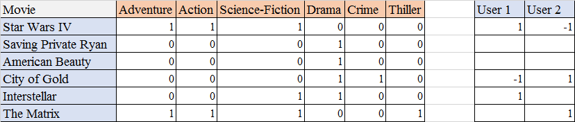 Trên đây là danh sách 6 bộ phim. Mỗi giá trị 0/1 thể hiện bộ phim đó không/có thuộc thể loại ở cột tương ứng. Bên cạnh đó, một hồ sơ người dùng cũng được tạo ra, với 1 là quan tâm, -1 là không, và null là chưa đánh giá. Như trong ví dụ trên, User 1 có quan tâm bộ phim Star Wars IV, còn User 2 thì không.