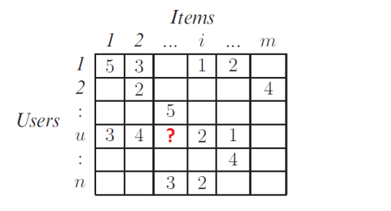 Đây là ma trận biểu diễn mức độ quan tâm (rating) của user với mỗi item. Ma trận này được xây dựng từ dữ liệu (1). Nhưng ma trận này có rất nhiều các giá trị miss. Nhiệm vụ của Hệ gợi ý chính là dựa vào các ô đã có giá trị trong ma trận trên (dữ liệu thu được từ trong quá khứ), thông qua mô hình đã được xây dựng, dự đoán các ô còn trống (của user hiện hành), sau đó sắp xếp kết quả dự đoán (ví dụ, từ cao xuống thấp) và chọn ra Top-N items theo thứ tự rating giảm dần, từ đó gợi ý chúng cho người dùng.