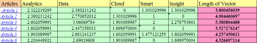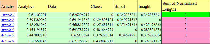 Như vậy, ta có thể có được các vector đặc trưng cho từng bài báo. Sau đó chúng ta có thể sử dụng độ tương đồng cosin để tính khoảng cách giữa chúng.