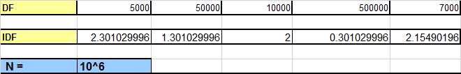 Trong các bài báo, 5000 chứa analytics, 50.000 chứa data và số lượng tương tự dành cho các từ khác. Chúng ta hãy giả sử rằng tổng số tài liệu là 1 triệu (10 ^ 6).