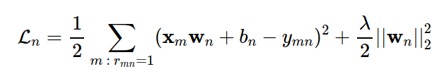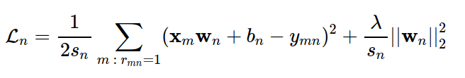 Xét một user thứ n bất kỳ, nếu ta coi training set là tập hợp các thành phần đã được điền của yn, ta có thể xây dựng hàm mất mát tương tự như sau: