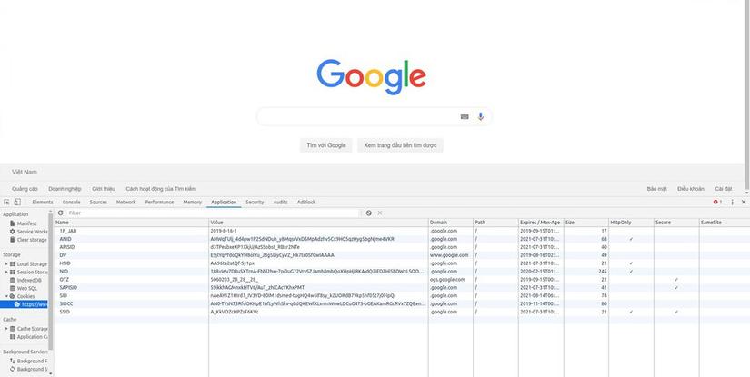 - Bạn thử mở trình duyệt -> click chuột phải -> chọn Inspect -> chọn Application -> chọn Cookies.