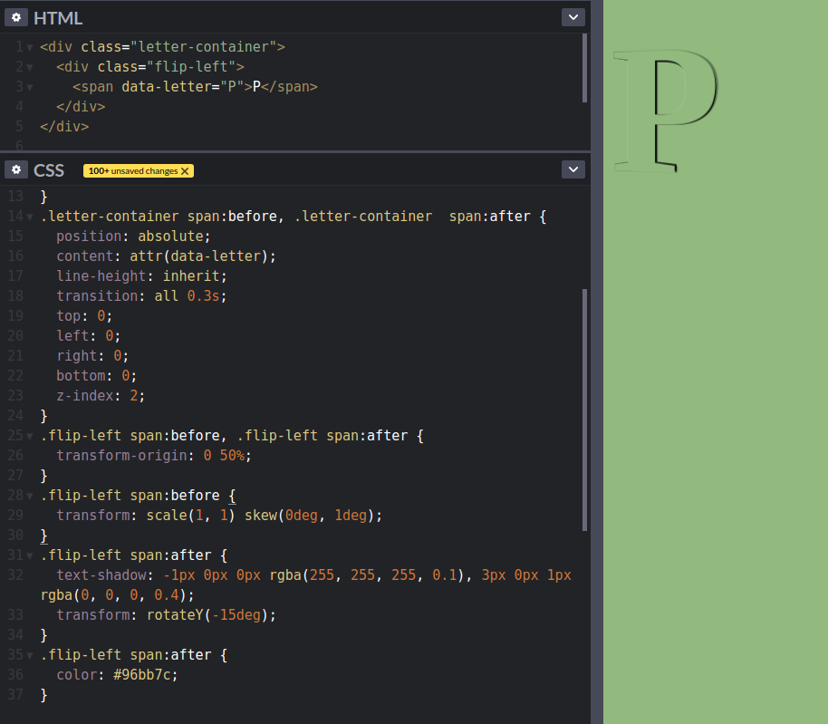 Về tư tưởng, mình sẽ sử dụng pseudo là :before và :after của span chứa chữ để lật hình. Mình cũng định làm 1 chuỗi chữ, nên để tiết kiệm thời gian cho thêm content: "P" cho mỗi ký tự khác nhau thì mình chèn data-letter kia có cùng nội dung với bên trong thẻ span, như vậy thì chỉ cần 1 dòngcontent: attr(data-letter); cho tất cả các pseudo là ổn