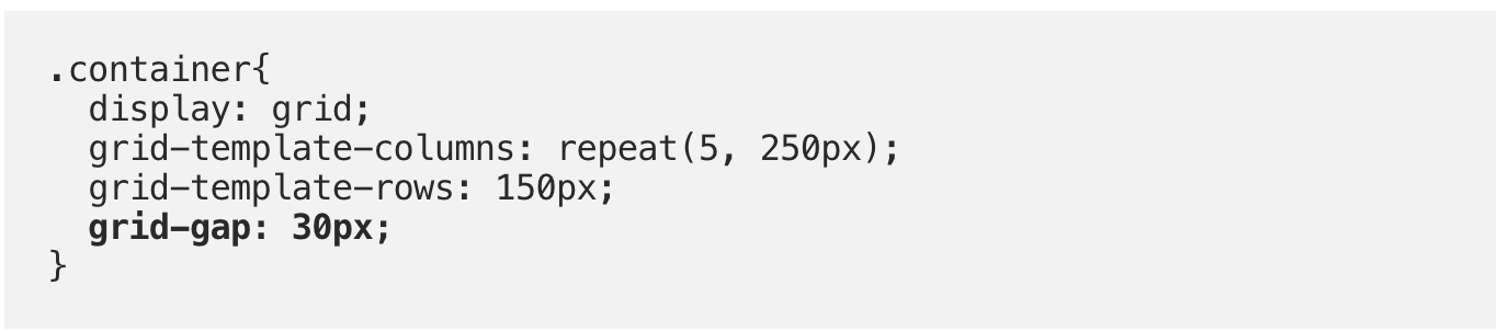 Với grid-template-columns tôi kích hoạt các cột mong muốn, trong trường hợp này là 5 cột với 250px mỗi cột. Với grid-template-rows, chúng tôi có thể đặt chiều cao của hàng (nếu cần) trong trường hợp này là tôi xét là 150px