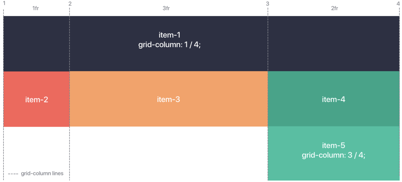 Điều tốt nhất là, tất cả các items có thể chiếm bao nhiêu không gian tùy thích ngay cả trong Grid. Với mục đích này, điểm bắt đầu được đặt bằng grid-column-start và điểm kết thúc bằng grid-column-end. Ngắn gọn là grid-column: startpoint / endpoint;