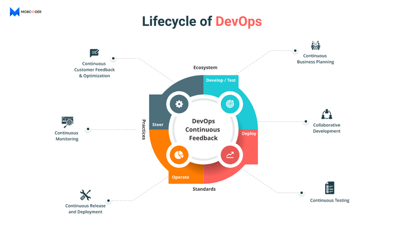 - Có nhiều giai đoạn tạo nên vòng đời DevOps, nhưng quy trình này sẽ giống như sau: