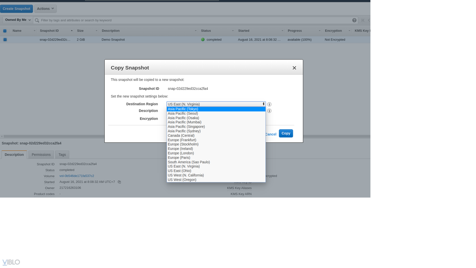 Giờ thì ta có thể copy snapshot này sang 1 region khác
