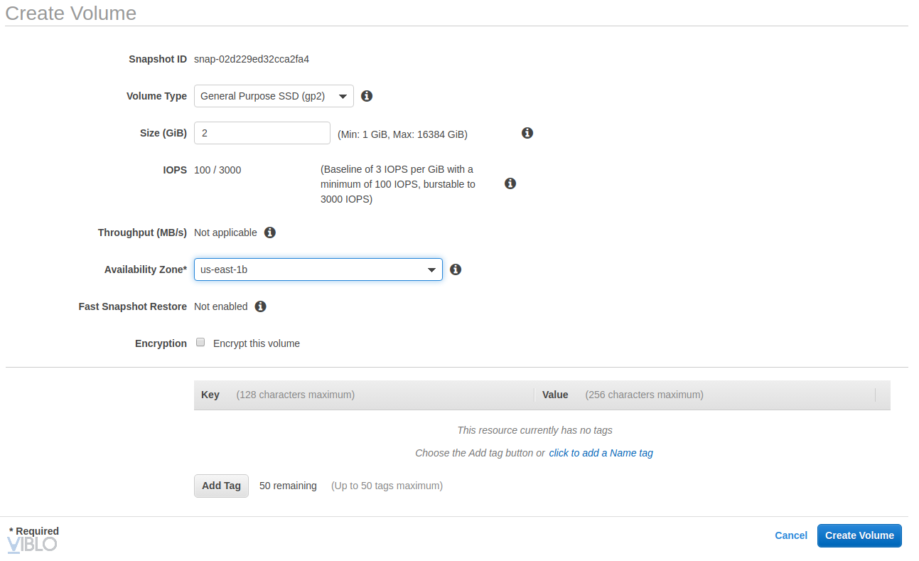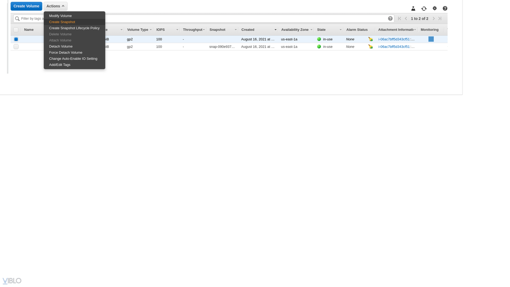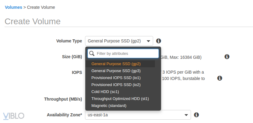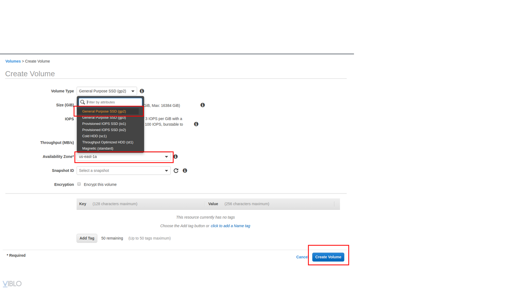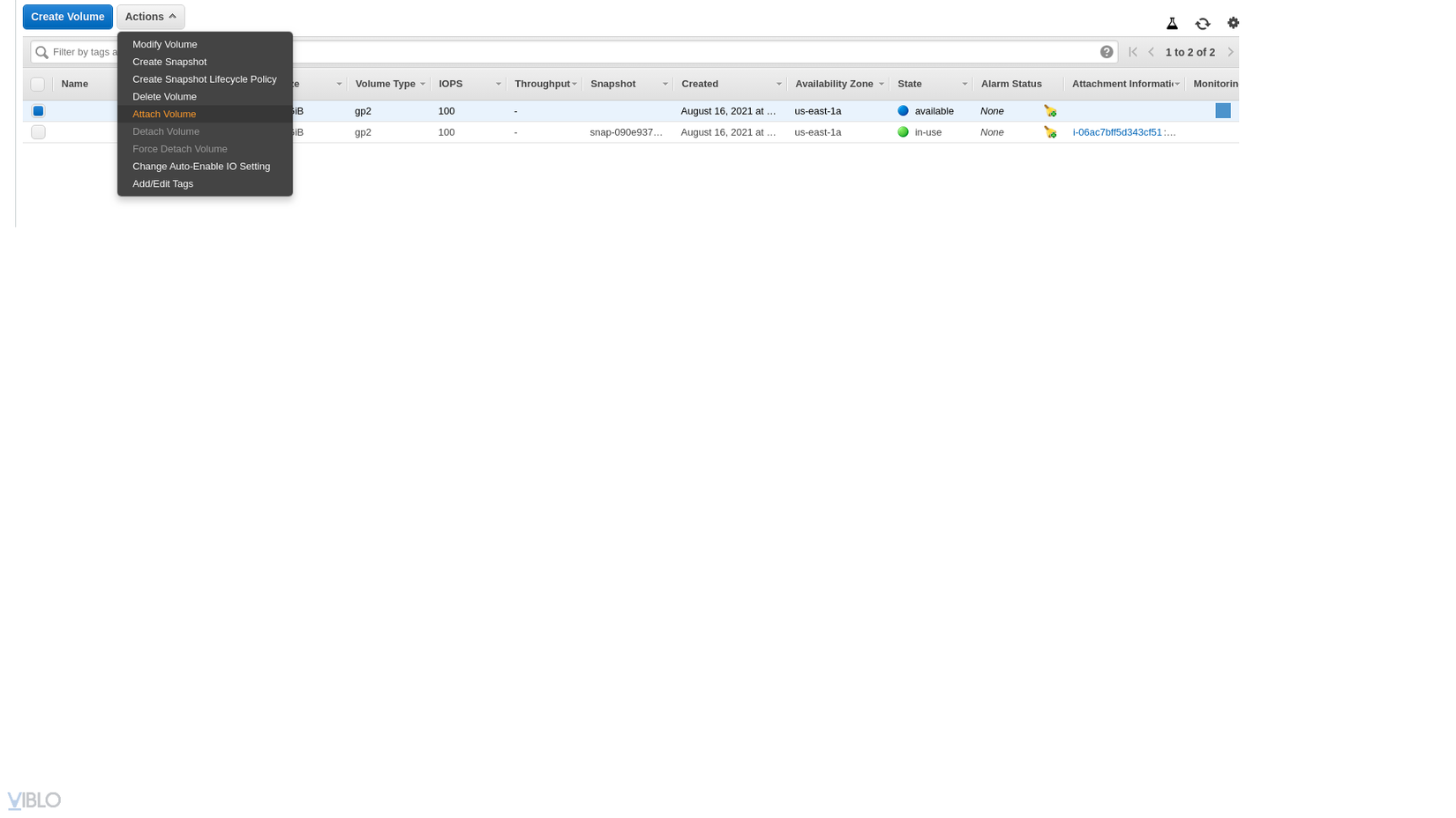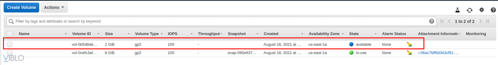 - Ta có thể tạo thêm EBS volume (button Create Volume góc trái). Ta chọn type gp2, set size 2GB chẳng hạn, và AZ của instance mà ta muốn gắn EBS này vào.