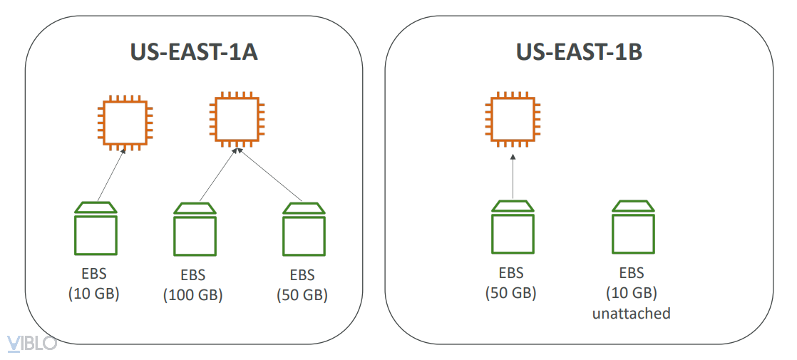 - EBS cũng thuộc về 1 AZ cụ thể. Ví dụ EBS A thuộc AZ "abc", nhưng instance B thuộc AZ "cde" thì không thể nào gắn EBS A cho instance B được.