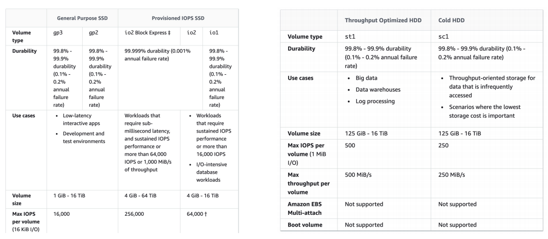 - Ngày nay ta dùng io2 nhiều hơn? --> io2 có độ bền cao hơn và nhiều IOPS hơn trên mỗi GB (cùng mức giá với io1)