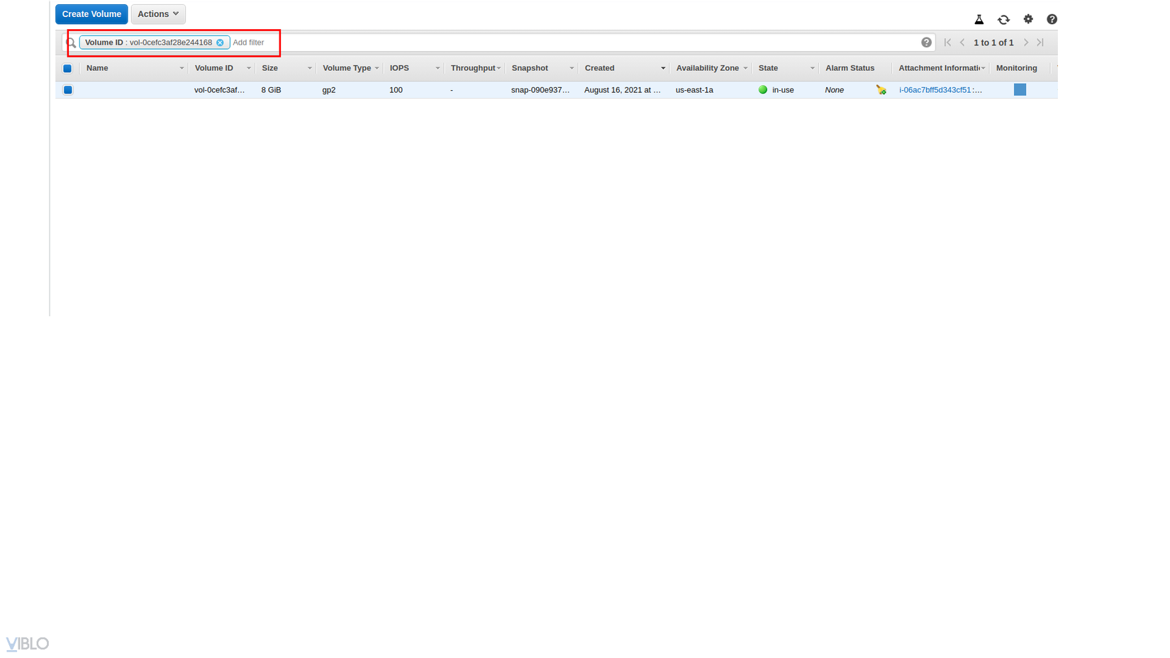 - Để xem lại EBS vừa tạo, ta remove filter như hình mới có thể thấy tất cả EBS trong AZ hiện tại.