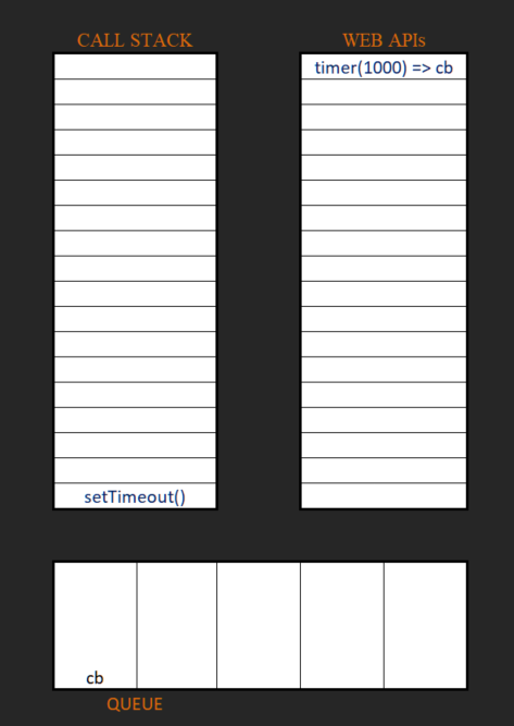 Tuy nhiên khi hàm setTimeout khởi chạy nó sẽ truyền qua WEB APIs 1 cái timer có thời gian là 1s, đồng thời truyền cho nó 1 cái Callback timer(1000) => cb.