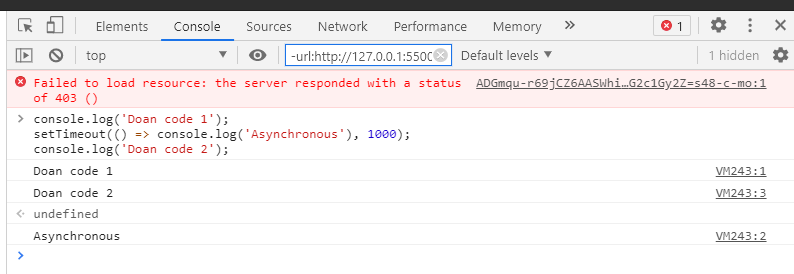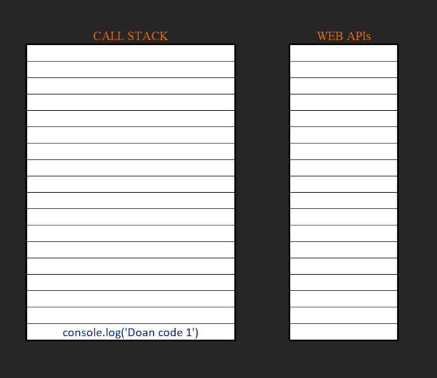 Trước tiên, hàm console.log('Doan code 1') được đưa vào Call stack và được chạy. Sau đó đến hàm setTimeout được đưa vào Call stack và chạy.