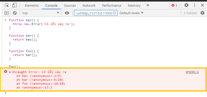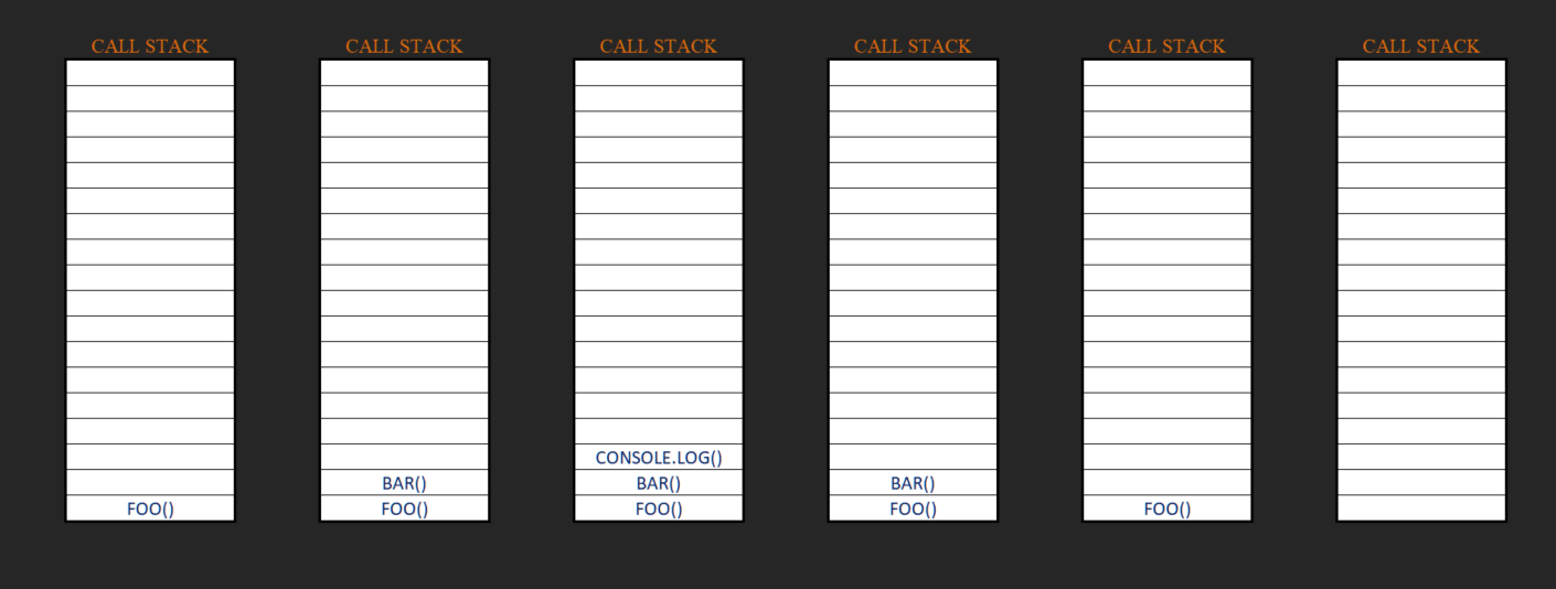 Qua đoạn code trên, ta có thể thấy hàm foo() được đưa vào Call stack trước sau đó đên hàm bar(), và cuối cùng là hàm console.log(). Sau khi hàm console.log() được gọi, nó sẽ được lấy ra khỏi Call stack, tiếp theo tới hàm bar(), cuối cùng là hàm foo().