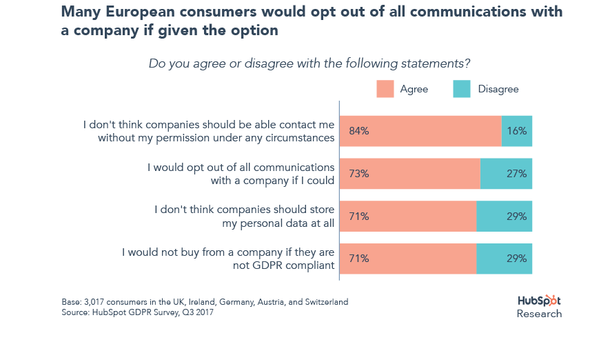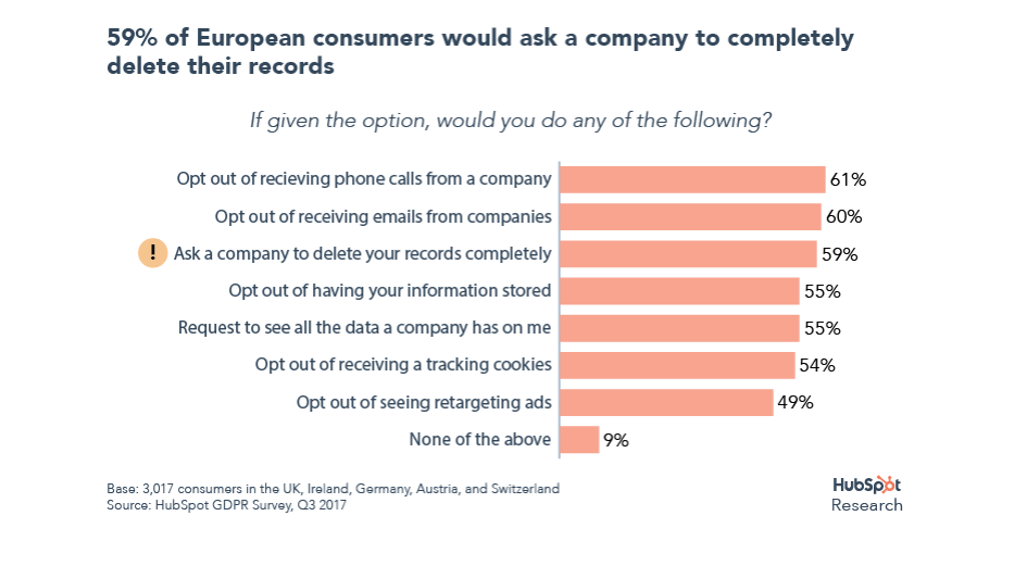 Theo như một khảo sát khác của Hubspot được thực hiện năm 2017,có tới 61% người dùng không mong muốn nhận được các cuộc điện thoại và email từ công ty cho mục đích tiếp thị. Trong đó 59% yêu cầu thông tin của mình bị xóa vĩnh viễn trên cơ sở dữ liệu hiện đang lưu trữ và 55% yêu cầu xem tất cả thông tin mà một công ty đang nắm giữ về họ.