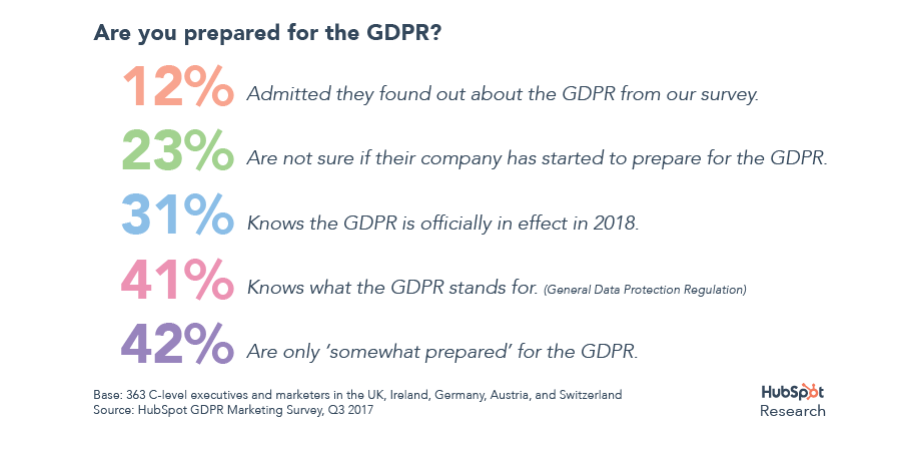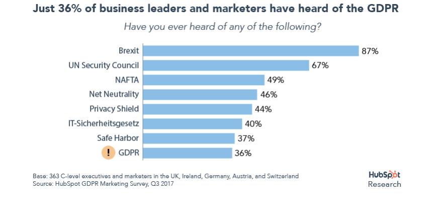 Cũng theo khảo sát trên, trong số 363 lãnh đạo doanh nghiệp và nhà tiếp thị được phỏng vấn chỉ có 36% trong số họ đã nghe nói về GDPR, 12% thừa nhận đây là lần đầu tiên họ biết về nó.Cuối cùng, chưa tới 50% số công ty được khảo sát đã "chuẩn bị áp dụng" GDPR cho doanh nghiệp của họ.