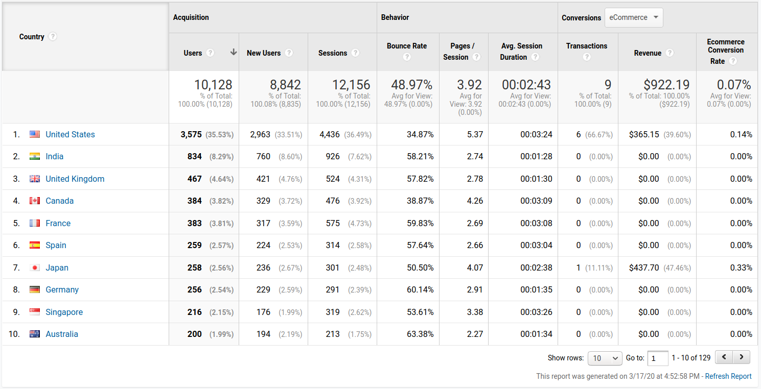 Một lần nữa thì với developer chúng ta thì qua phần này thì chúng ta cũng chỉ biết được là truy cập vào trang của chúng ta đang chủ yếu nằm ở đâu trên thế giới. Tuy nhiên khi chúng ta áp dụng các bộ khác nhau vào thì phần này sẽ giúp chúng ta chỉ ra được rằng ở khu vực nào trên thế giới đang có tỉ lệ người dùng mới truy cập vào trang web của chúng ta để từ đó ta có thể triển khai việc hỗ trợ cho vùng quốc gia hay ngôn ngữ đó khi truy cập vào trang.