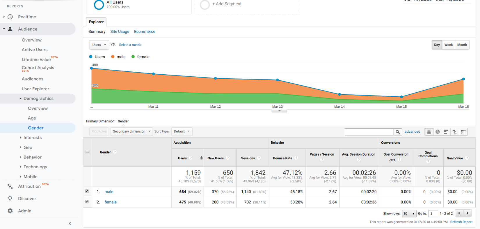 Audience/Demographicssẽ lưu trữ các thông tin liên quan đến tuổi và giới tính của người dùng trên trang của chúng ta: