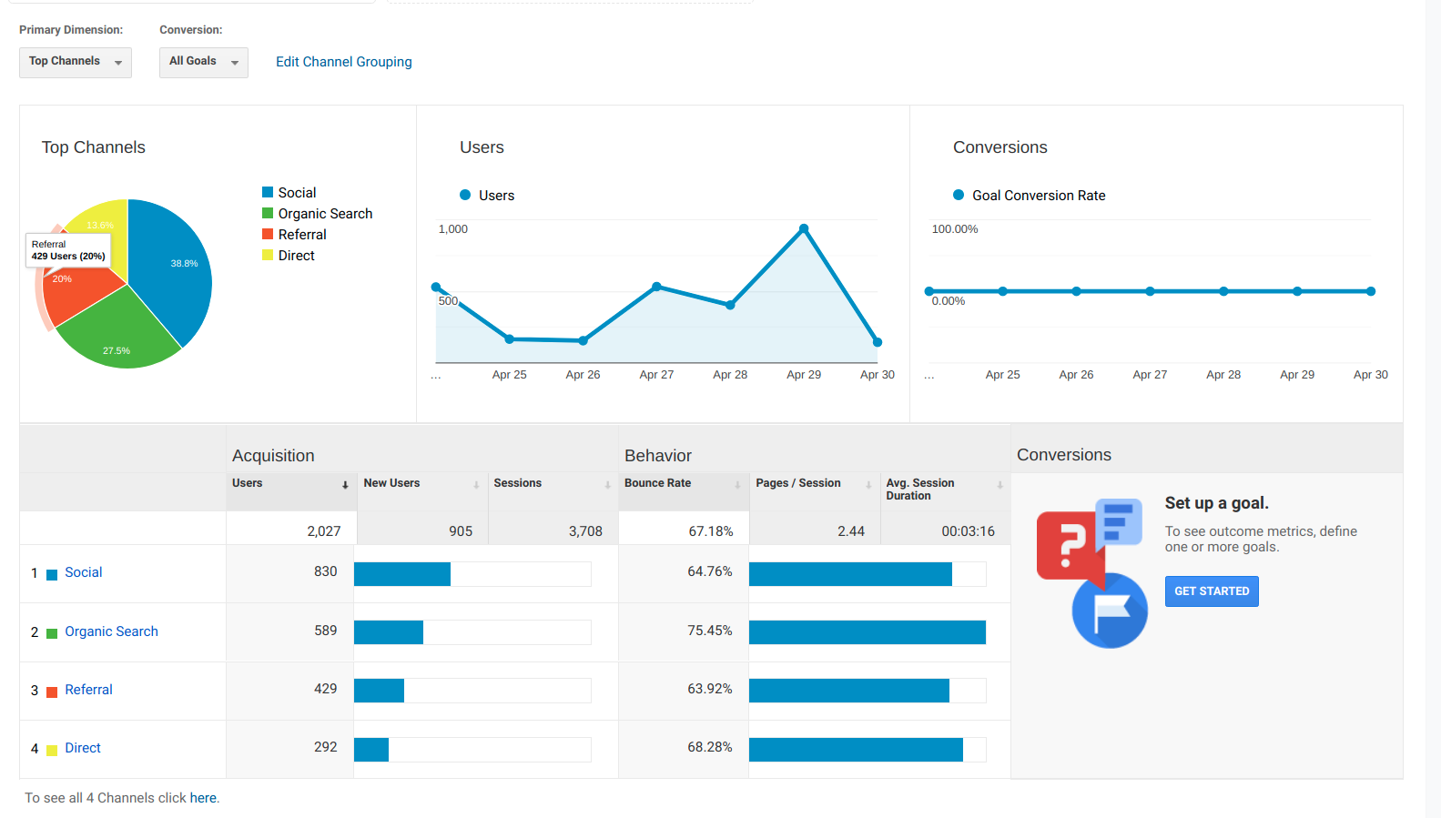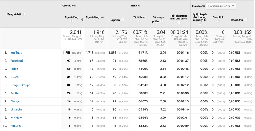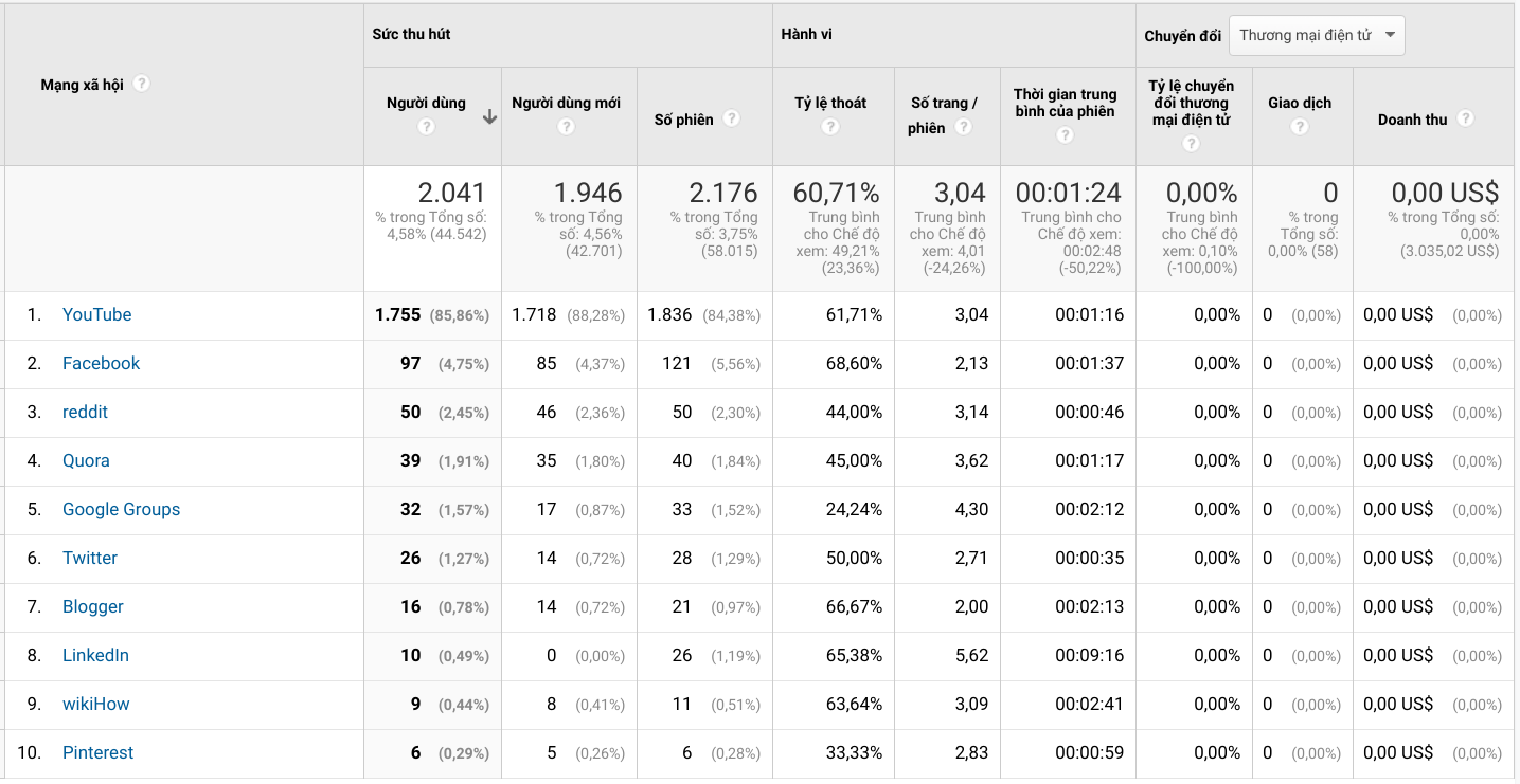Như hình trên ta thấy chúng ta sẽ có một số channel cơ bản là Organic Search sẽ bao gồm toàn bộ các Source người dùng sử dụng để tìm kiếm và truy cập vào trang web của chúng ta. Tương tự với các channel còn lại. Ở đây bạn có t hể thấy ta có hai channel là Social và Referral, thực chất 2 channel này đều có cùng một Medium là Referral, tuy nhiên GA đã tự gom nhóm chúng thành 2 channel khác nhau một channel sẽ liên quan đến nguồn giới thiệu từ các trang mạng xã hội và một channel liên quan đến các nguồn referral còn lại. Cụ thể khi chúng ta chọn vào channel Social sẽ thấy như sau: