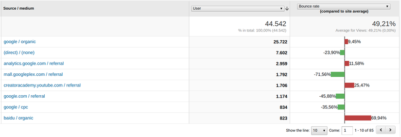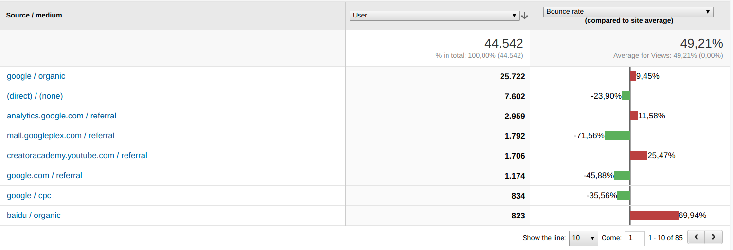 Như bạn thấy thì biểu đồ này sẽ dùng để so sánh Bounce Rate trung bình của trang web chúng ta với tất cả các Source/Medium chúng ta đang thấy. Với Source/ Medium là mail.googleplex.com/ referral ta thấy tỉ lệ Bounce Rate của nó thấp hơn tận 71% (Bounce Rate càng thấp thì càng tốt) so với toàn trang nghĩa là ở đây chúng ta đang có một nguồn người dùn truy cập "chất lượng cao". Từ các thông tin như vậy ta có t hể xác định chính xác hết về việc chọn quảng cáo hoặc tập chung đẩy bài lên đâu.