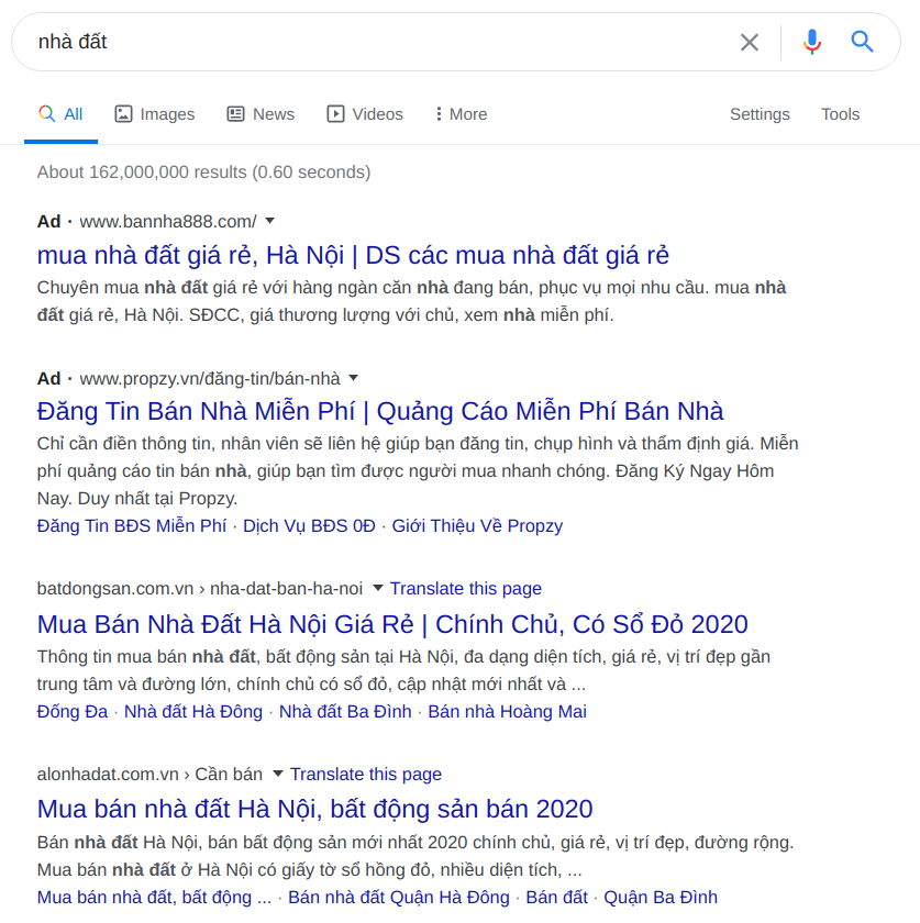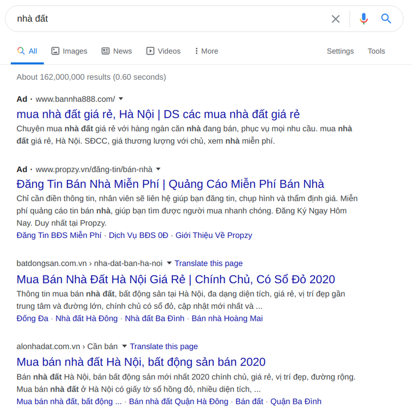 CPC - cost per click - tìm kiếm miễn phí: tương tự cũng là người dùng truy cập vào trang web của bạn thông qua tìm kiếm trên Google Search nhưng ở đây người sở hữu trang web phải trả phí cho những lượt truy cập như này. Cụ thể ví dụ khi chúng ta tìm kiếm từ khóa "nhà đất" trên Google sẽ thu được kết quả như sau: