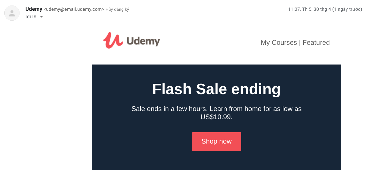 Phía trên là một email quảng cáo mà mình nhận được từ bên Udemy. Nếu mình click vào chữ Shop now thì lập tức mình sẽ được chuyển qua trang Udemy và lượt truy cập này sẽ được tính là Email.