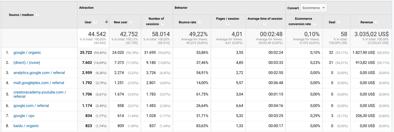 Như trong hình nói trên chúng ta có thể thấy lượt view nhiều nhất mà chúng ta thu thập được ở đầy là từ nguồn tìm kiếm miễn phí thông quan google (google/ organic), tiếp đó là thông qua việc truy cập trực tiếp vào trang web của chúng ta (direct/ none) và thứ ba đó chính là thông qua nguồn giới thiệu từ analytics.google.com (analytics.google.com/ referral). Dựa vào thông tin này bạn có thể xác định được nguồn nào đang đem lại cho bạn nhiều lượt truy cập nhất để có thể tập chung vào việc quảng cáo qua các nguồn đó.