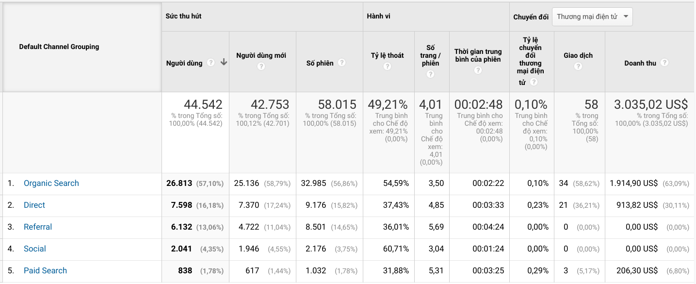 Ngoài việc xem báo cáo liên quan đến sự kết hợp giữa Source/ Medium cụ thể như mình đã giới thiệu qua ở bài trước, chúng ta cũng có thể xem riêng phần thống kê xem nguồn nào đem lại lượ truy cập vào trang web của chúng ta nhiều nhất thông qua tab Acquisition/ All Traffic/ Channels: