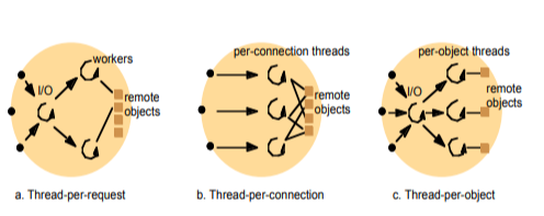 Ưu điểm của kiến trúc b) và c): Không tốn nhiều overhit vì không phải tạo và hủy nhiều luồng do số lượng đối tượng kết nối và đối tượng từ xa là không thay đổi nhiều