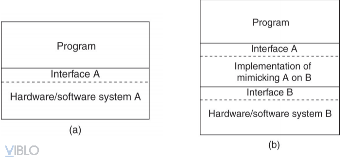 - Hình b): Khi đem cùng những chương trình kèm theo giao diện A sang 1 hệ thống khác (hệ thống B), lúc này cần 1 tầng trung gian để mô phỏng sự triển khai của hệ thống A trên hệ thống B. Cụ thể là triển khai các phương thức hệ thống A bằng các gọi phương thức tương ứng của hệ thống B mà giao diện B cung cấp. Tâng trung gian này mô phỏng ý tưởng của thực hiện ảo hóa (giả lập môi trường làm việc của hệ thống này trên môi trường làm việc của hệ thống khác)