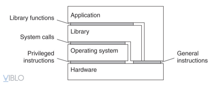 - Giao diện giữa phần cứng và phần mềm bao gồm các tập lệnh máy chỉ có thể được gọi các chương trình đặc quyền, ví dụ như HĐH