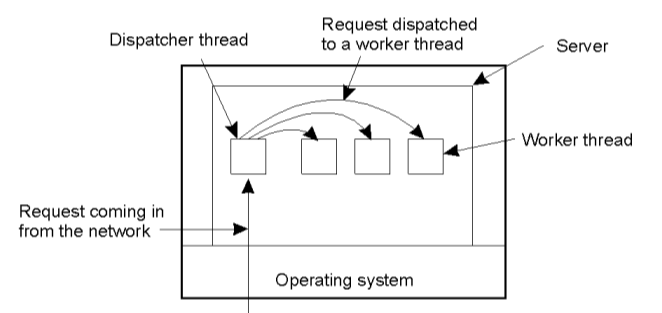 Trong mô hình này ngoài các luồng để xử lý các công việc, tiến trình server có 1 luồng chuyên dụng đảm nhiệm chức năng điều phối các công việc y/c gọi là Dispatcher.Mỗi khi nhận được y/c luồng này sẽ phân tích y/c đó và gửi đến cho luồng phù hợp để xử lý