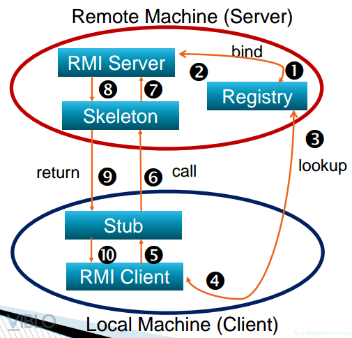 - (3), (4): RMI-client liên lạc với Registry Server để lấy về tham chiếu đến đối tượng trên Server. Các quá trình đăng ký và truy tìm tên đối tượng được Java quản lý bằng các hàm giao tiếp API JNDI