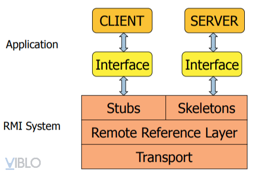 - Lớp trung gian Stub và Skeletion: có nhiệm vụ chặn các lời gọi phương thức của Client tới các biến tham chiếu và gửi tới dịch vụ từ xa. Lớp Skeletion sẽ đọc các tham số của lời triệu gọi từ xa từ 1 liên kết nào đó, thực hiện lời gọi tới đối tượng thực thi dịch vụ từ xa, sau đó gửi trả giá trị lại cho Stub