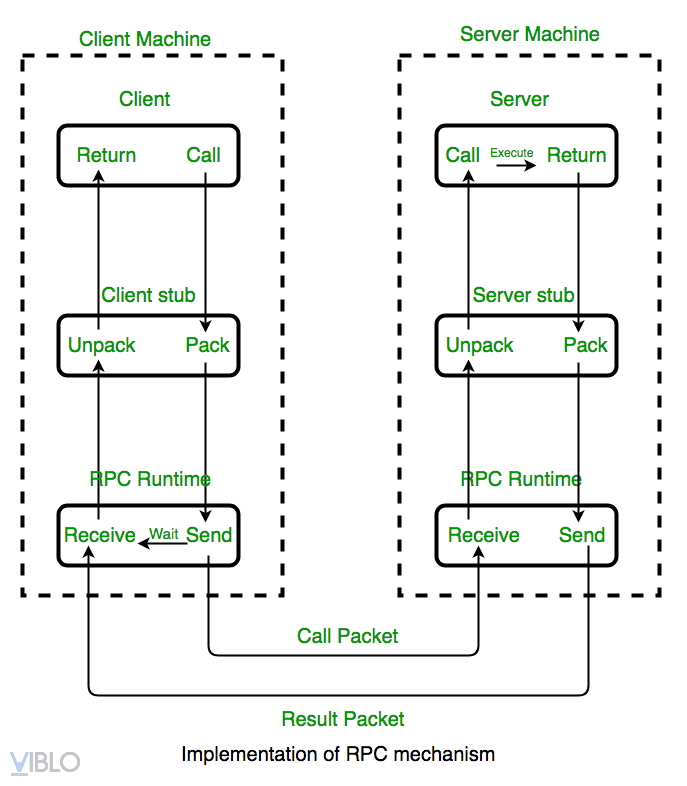 Khi một tiến trình trên máy A (client) muốn thực hiện một thủ tục nào đó nằm trên máy B (server ) nó sẽ thực hiện một lời gọi thủ tục từ xa tới máy B. Tiến trình gọi trên A sẽ bị treo, và quá trình thực thi thủ tục được gọi diễn ra trên máy B dựa trên các tham số được truyền đến từ máy A và kết quả sẽ được truyền trở lại cho máy A tương ứng.