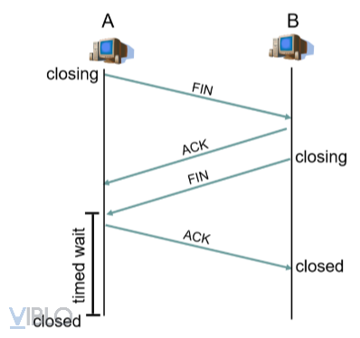 - Host B nhận được gói FIN, gửi gói ACK trả lời lại, đồng thời vào vào trạng thái “chờ” và gửi tiếp gói FIN