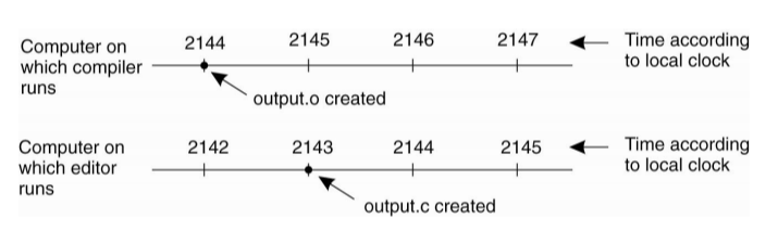 • File output.o có thời gian là 2144 và gần như ngay sau đó output.c bị thay đổi nhưng lại được đánh dấu thời gian là 2143 vì đồng hồ trên máy đó chậm hơn 1 chút. Do đó lệnh make sẽ không gọi trình biên dịch. Kết quả là chương trình được biên dịch ra lẫn lộn giữa các đối tượng từ file nguồn cũ và mới. Dẫn đến có lỗi trong chương trình mà lập trình viên không thể kiểm soát hoặc hiểu được.