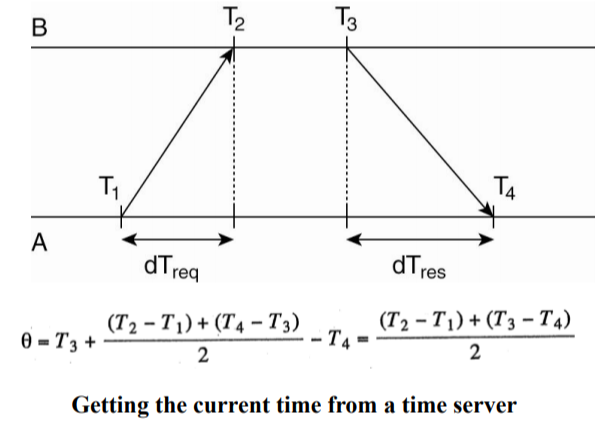 • Nhưng do độ trễ của mạng khi trả lời nên tại thời điểm T4 tính theo đồng hồ của A nó mới nhận được phản hồi của B.