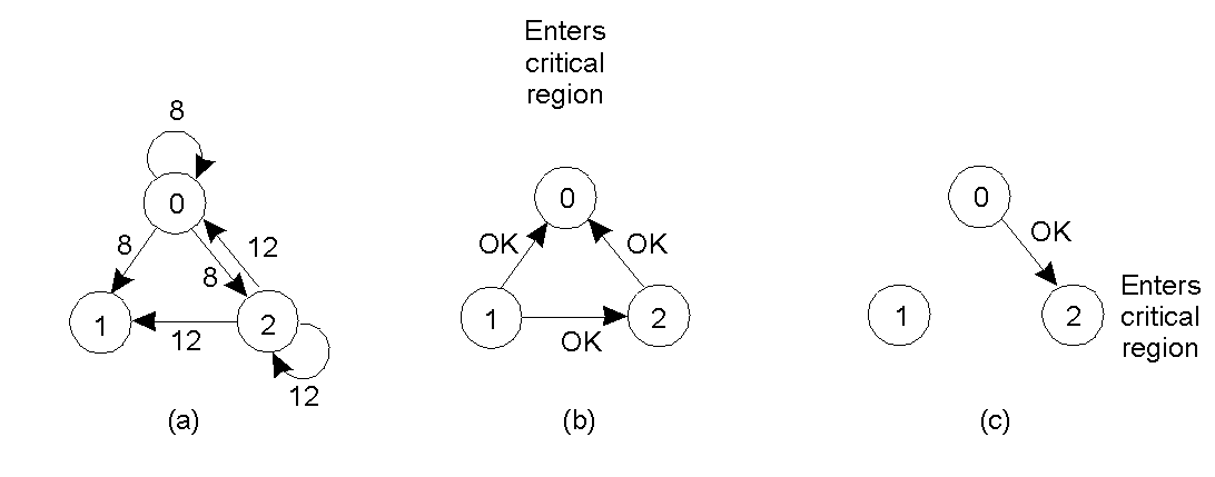 • (c): Nếu bên nhận cũng muốn truy cập tài nguyên chia sẻ nhưng chưa được phép, nó sẽ so sánh nhãn thời gian (timestamp) của thông điệp gửi đến với timestamp chứa trong thông điệp mà nó gửi đi cho những tiến trình khác. Nếu thông điệp đến có timestamp thấp hơn, bên nhận sẽ gửi thông điệp OK, nếu không thì nó không gửi gì cả.