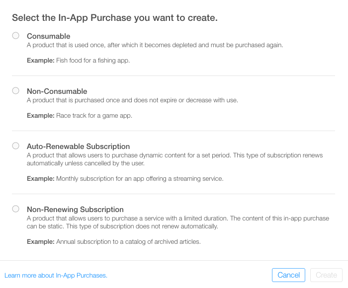 Apple quy định các loại Products để thanh toán theo các mục đích khác nhau. Dưới đây là 4 loại products mà bạn có thể thêm vào tính năng thanh toán IAP: