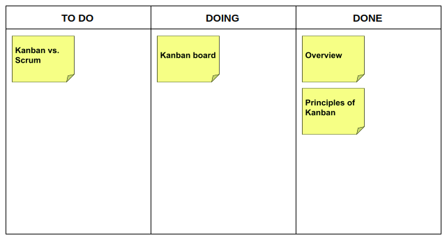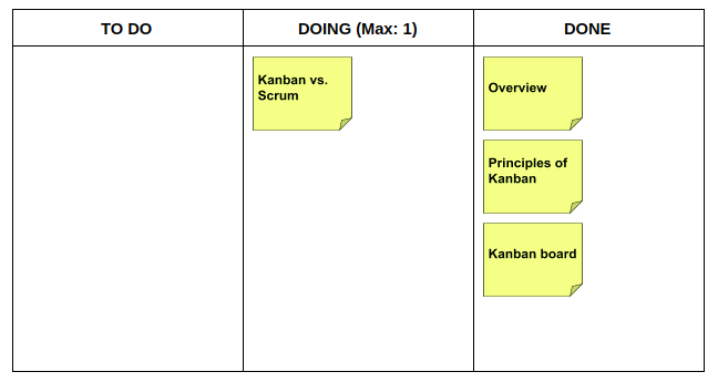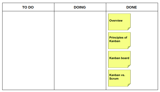 Viết tên các task lên Kanban card rồi sắp xếp vào các cột tương ứng. Chúng ta sẽ có các task cần làm như sau: Overview, Principles of Kanban, Kanban board, Kanban vs. Scrum.