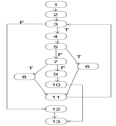 path 8: 1-2-3T-4-5F-7T-8-11-3T-4-5F-7T-8-11-3F-12-13=> TCs t= (x=4, v={0,1,2,3},n=4)