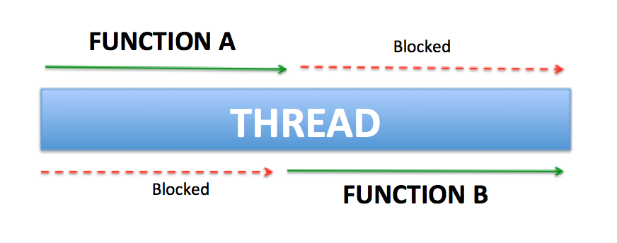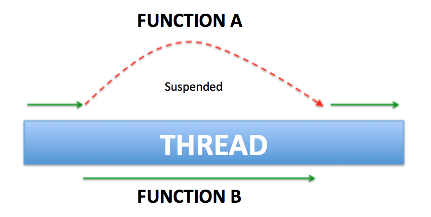 Hình ảnh biểu diễn một thread đang chạy 2 function là functionA và functionB. Chúng ta có thể thấy thread đó phải chạy xong function A rồi mới đến functionB. Đây là cách chạy phổ biến của normal function mà chúng ta vẫn hay code.