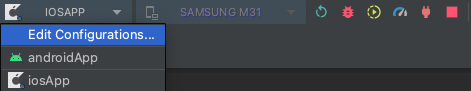 - Sau khi IDE đã cài đặt và đồng bộ project xong, bạn sẽ thấy sẽ có 2 config để chạy: 1 cho Android, 1 cho iOS